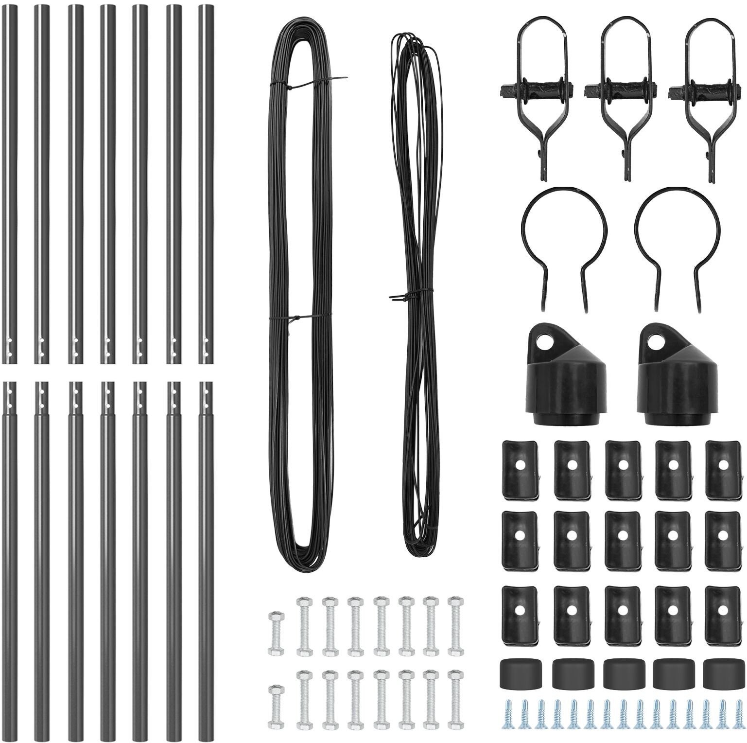 - Delivery Contains: 5 x post, 2 x słup pod kątem, 5 x plastikowa nakrywka, 15 x plastikowy podpora drutu naciągowego, 2 x nakrywka do słupa pod kątem, 2 x okucia do słupa pod kątem, 3 x napinacz, 1 x 25 m drut wiążący, 1 x 33 m drut naciągowy