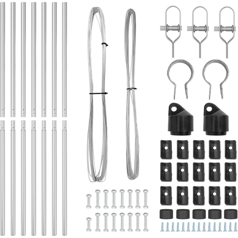 - Delivery Contains: 5 x Słup, 2 x Słup Kątowy, 5 x Zatyczka Plastikowa, 15 x Wsparcie Naciągu, 2 x Zatyczka Słupa Kątowego, 2 x Akcesoria Słupa Kątowego, 3 x Naciągacz, 1 x 25m Drut Wiążący, 1 x 33m Drut Naciągowy