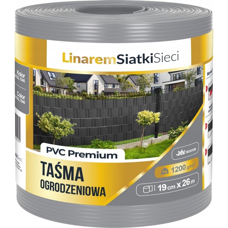 Linarem SiatkiSieci TAŚMA OGRODZENIOWA PREMIUM 1200g SZARA DO OGRODZENIA PANELOWEGO 19cmx26m