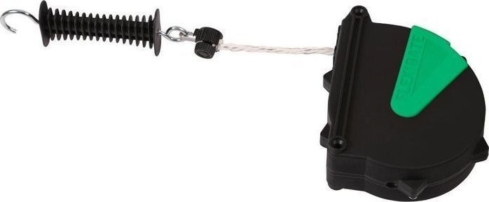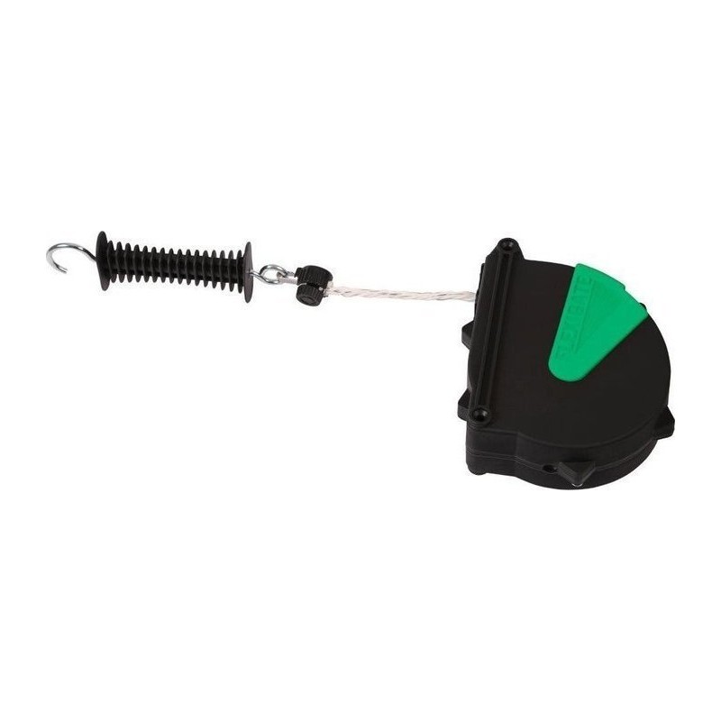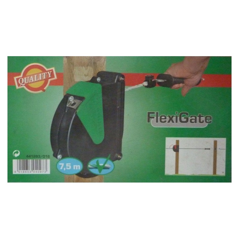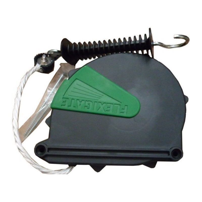 Zestaw Flexigate umożliwia podłączenie wejścia padoku do obwodu elektrycznego zawartego w ogrodzeniu. Linka zostaje zwinięta automatycznie wewnątrz kasety. Zalety: • mocowanie za pomocą 2 śrub bezpośrednio drewnianego palika • maksymalne rozciągnięcie liny do 7,5 m • odpowiednie naciągnięcie liny • brak możliwości potknięcia się przez przechodzących ludzi lub zwierzęta • nie blokują się na nim włosy z ogona Odpowiedni do ogrodzeń elektrycznych. Możliwość podłączenia do obwodu elektrycznego.