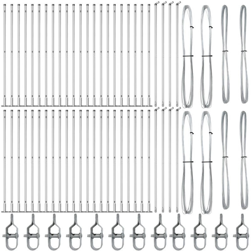 - Delivery Contains: 44 x Słup, 8 x Słup kątowy, 44 x Płyta podstawowa, 44 x Kapturek plastikowy, 132 x Wspornik plastikowego drutu napięciowego, 8 x Kapturek słupa kątowego, 8 x Elementy mocujące słupa kątowego, 12 x Napinacz, 4 x 25 m Drut wiążący, 4 x 80 m Drut napięciowy
