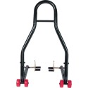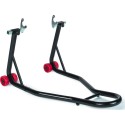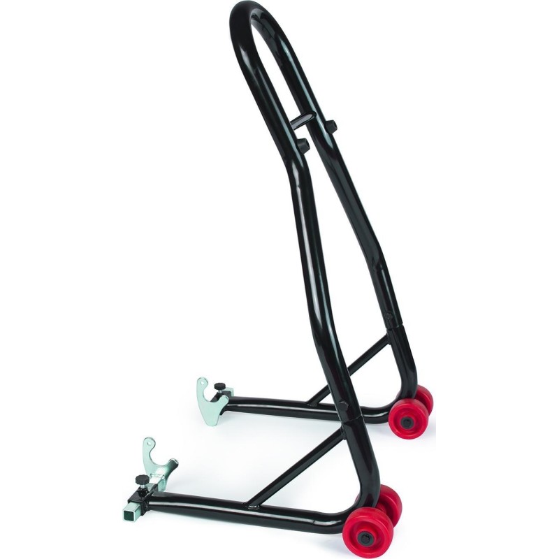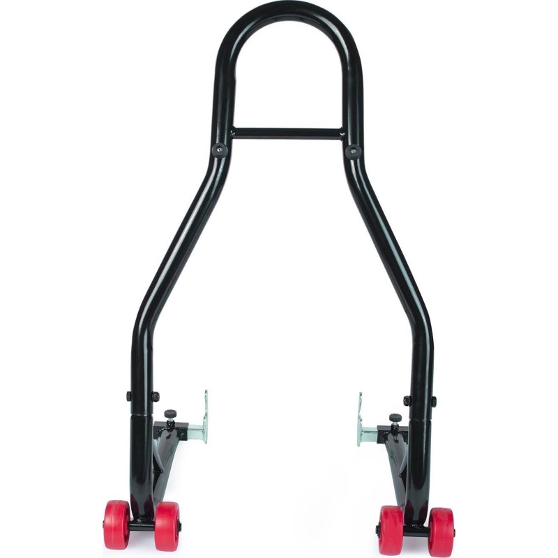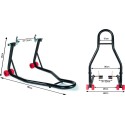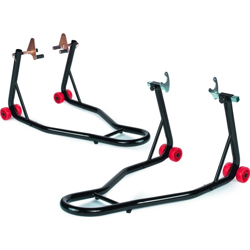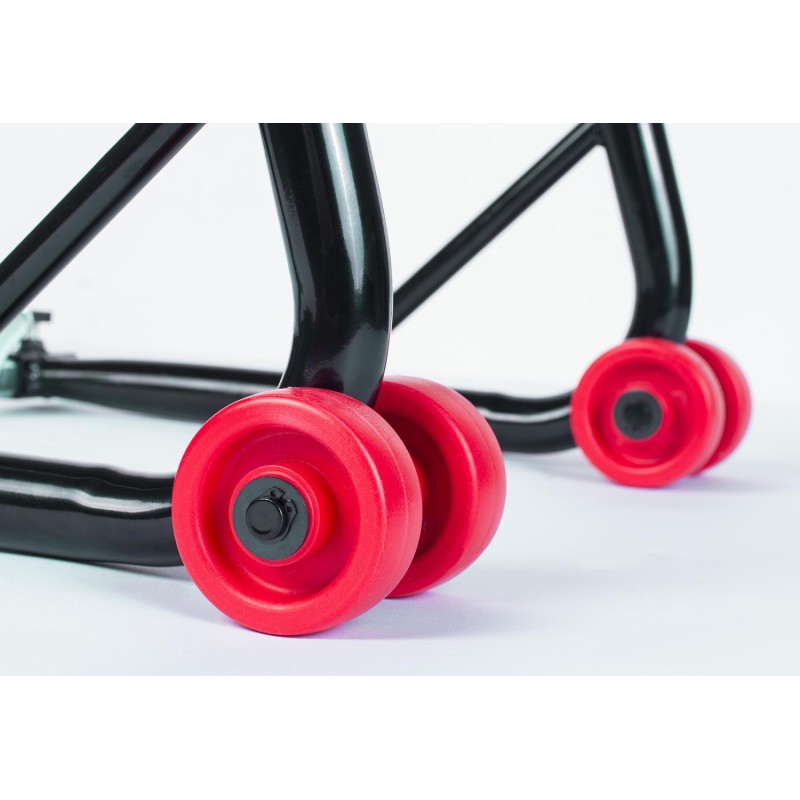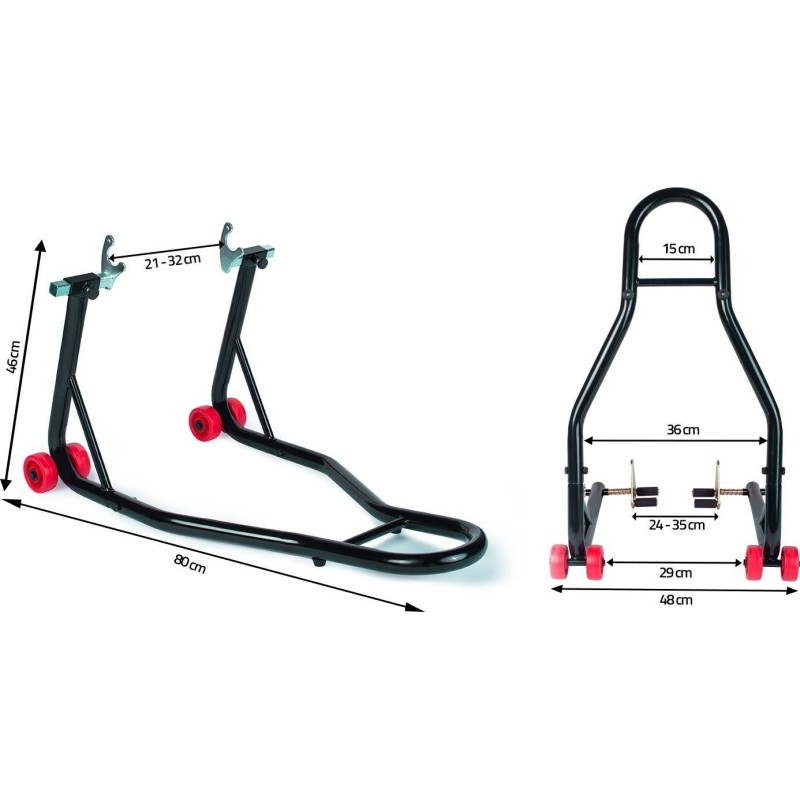 Stojak posiada regulowane adaptery. Wysokość tego modelu to 46 cm, a długość 80 cm. Doskonale sprawdzi się w niewielkich pomieszczeniach, w których liczy się każdy kawałek przestrzeni. Wyposażony jest w podwójne, dodatkowo wzmocnione koła. To doskonały sposób na przechowanie motocyklu lub prace serwisowe! Zestaw obejmuje dwie sztuki.