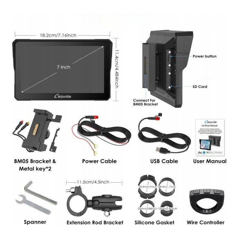 Motocyklowy ekran Carpuride W702S Carplay/Android Auto uchwyt BM05 nowy