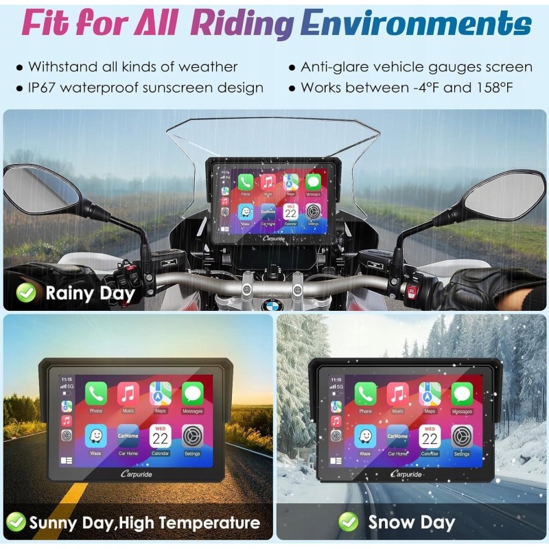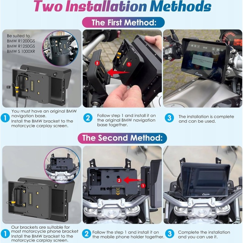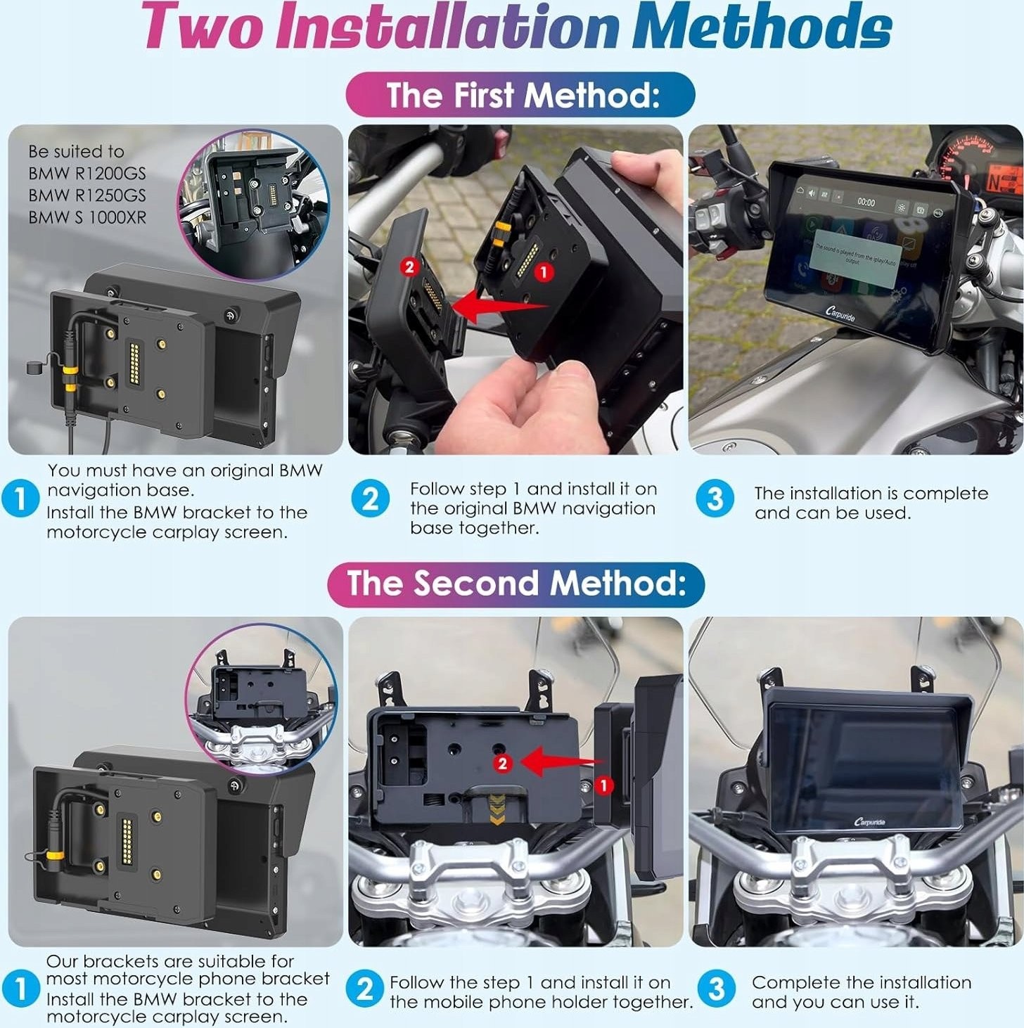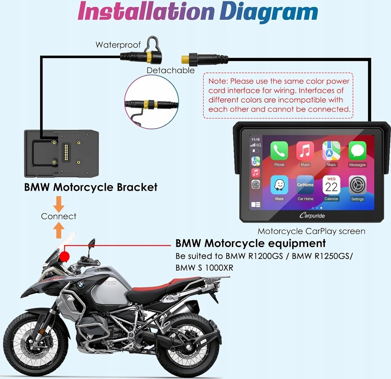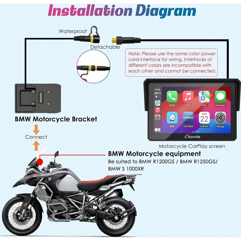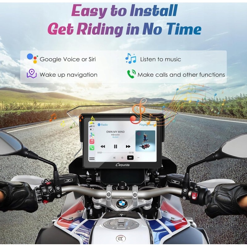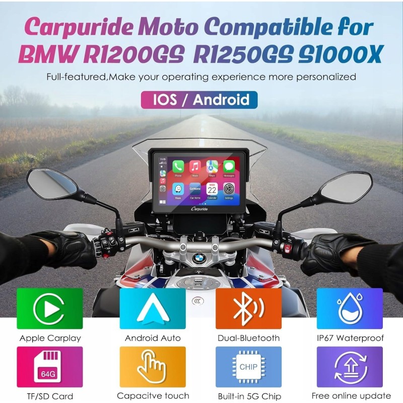- Bezprzewodowe CarPlay i Android dla motocykli BMW: Carpuride W502b Carplay z indywidualnym uchwytem na motocykl jest przeznaczony do motocykli BMW i kompatybilny z CarPlay lub Android Auto. Poprzez bezprzewodowe połączenie smartfona z ekranem dotykowym motocykla za pośrednictwem Bluetooth, można uzyskać dostęp do nawigacji, rozmów, odtwarzania muzyki, wiadomości tekstowych i wielu innych za pomocą Siri lub G00gle. Dzięki swobodzie rąk można skupić się na drodze i jeździć bezpiecznie.