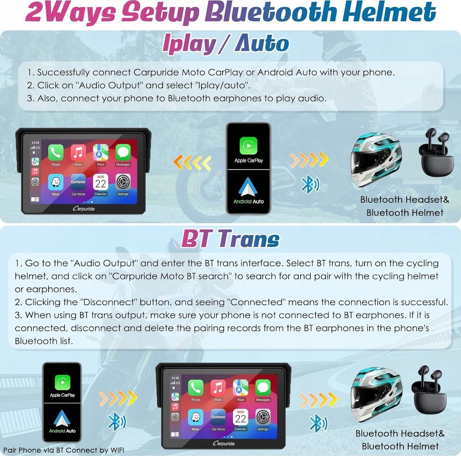 - ️【Podwójnie zintegrowany Bluetooth】: Carpuride W502b jest wyposażony w zintegrowane podwójne połączenie Bluetooth. Połącz ekran dotykowy CarPlay z telefonem komórkowym i słuchawkami Bluetooth lub kaskiem. Można wykonywać połączenia bez użycia rąk lub słuchać ulubionej muzyki bez konieczności zdejmowania kasku. Dzięki praktycznemu podwójnemu połączeniu Bluetooth twój telefon nie tylko pozostaje bezpieczny w kieszeni, ale możesz również cieszyć się wolnością podróżowania.