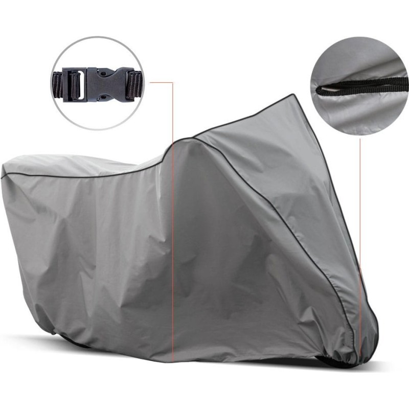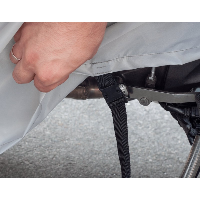 Mocowany za pomocą solidnego ściągacza przy przednim i tylnym kole oraz taśmy z plastikową klamrą w środkowej części pokrowca. Dzięki temu plandeka całkowicie przylega do motocykla nawet podczas silnych zmian pogody.