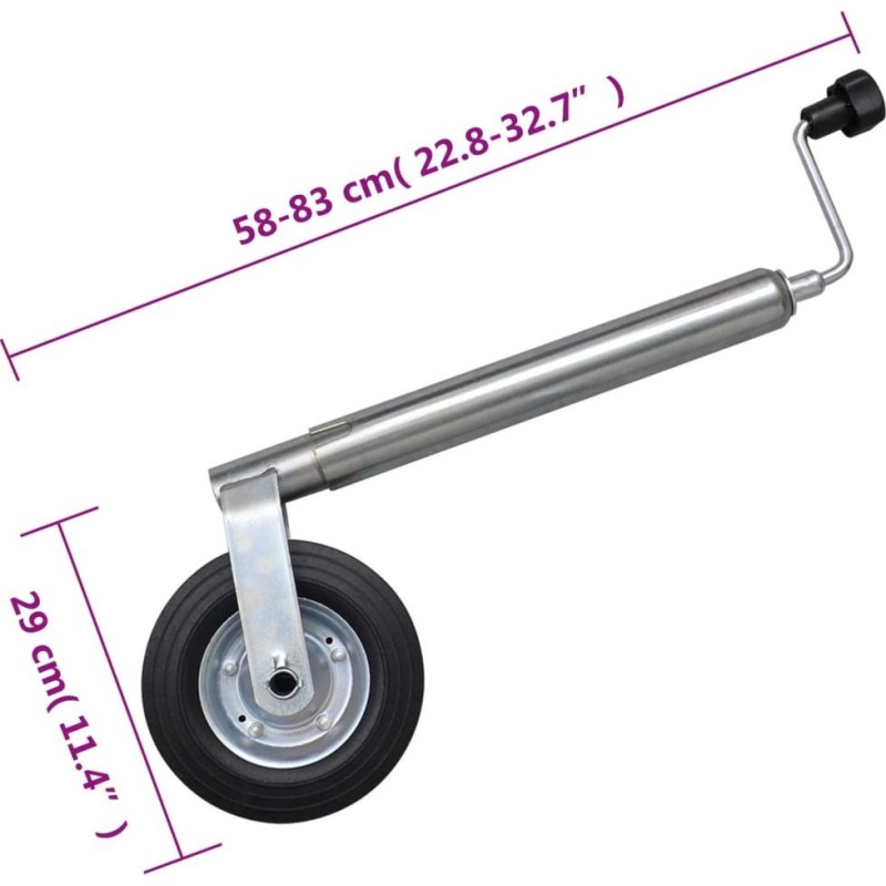 - Koło podporowe: wykonane z wysokiej jakości stali galwanizowanej koło jest odporne na rdzewienie i solidne. Jego maksymalne obciążenie wynosi 150 kg, dzięki czemu sprawdzi się doskonale przy większości małych i średnich przyczep, w tym kempingowych. Gumowe koło umożliwia łatwe manewrowanie przyczepą.