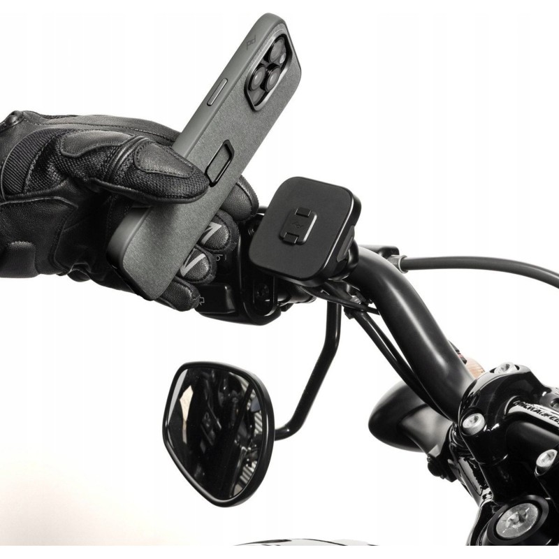 Niskoprofilowe mocowanie telefonu, które zmniejsza bałagan na kierownicy, mocowanie hamulca/sprzęgła motocykla mocuje się do gwintu śruby w gnieździe hamulca lub sprzęgła i utrzymuje telefon sztywno zabezpieczony, natychmiast dostępny, doskonale widoczny i w pełni naładowany dzięki wiodącemu w branży ładowaniu bezprzewodowemu Qi2 (opcjonalnie).