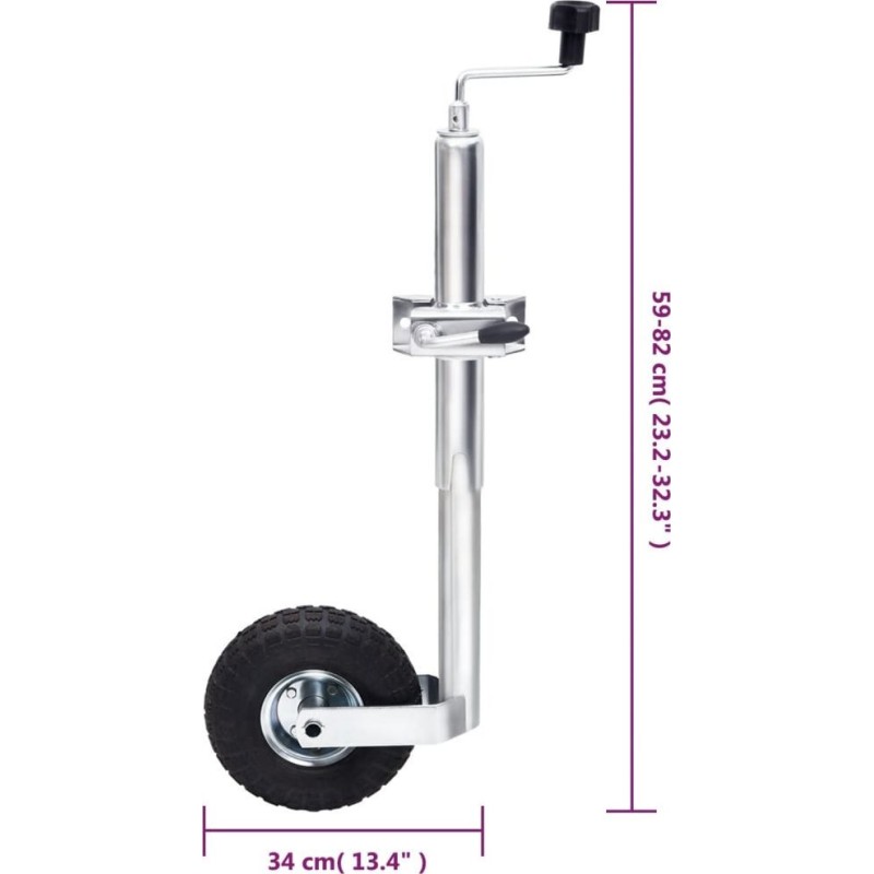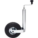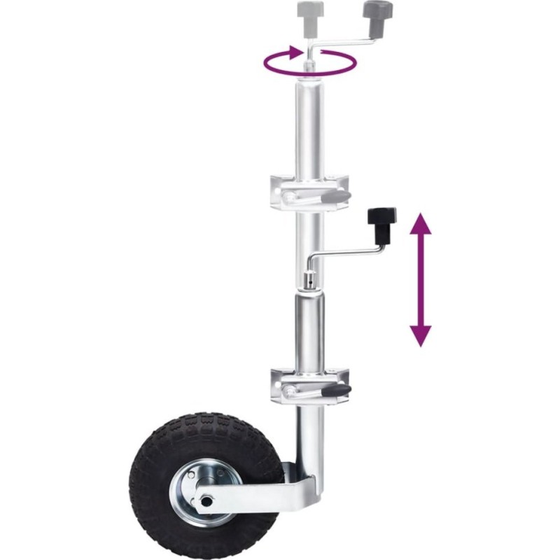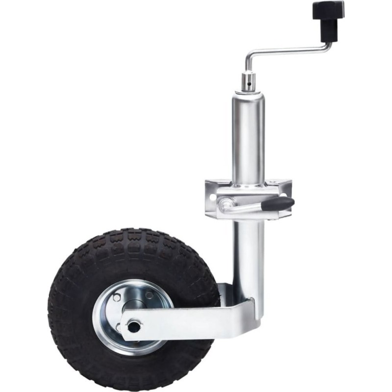 - Koło podporowe: wykonane z wysokiej jakości stali galwanizowanej koło jest odporne na działanie rdzy i solidne, a jego maksymalne obciążenie wynosi 150 kg, dzięki czemu sprawdzi się doskonale przy większości małych i średnich przyczep, w tym kempingowych. Solidna guma użyta do wykonania opony umożliwia łatwe manewrowanie przyczepą.