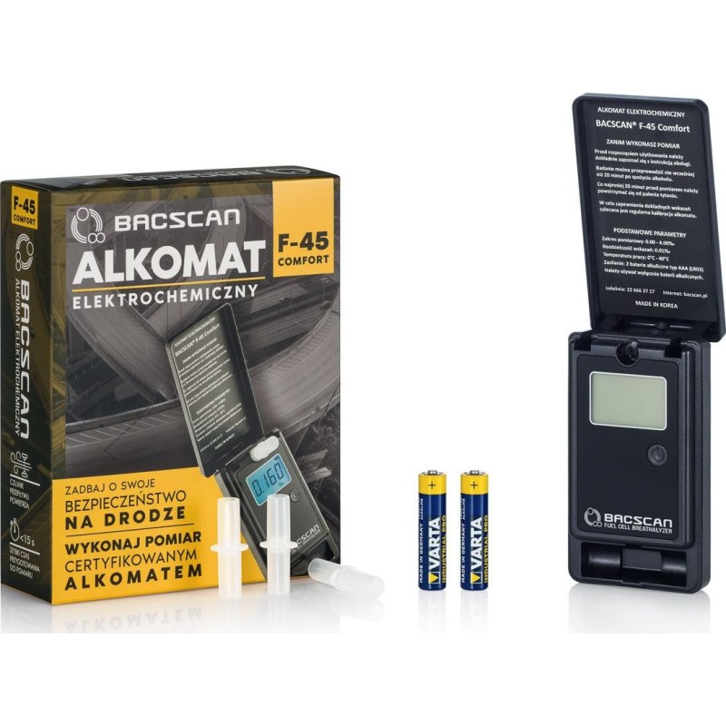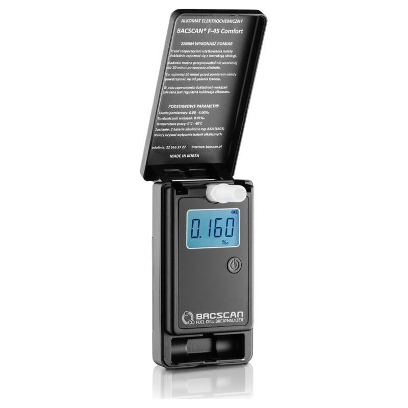 Model F-45 Comfort to wysokiej jakości alkomat oparty na platynowym sensorze elektrochemicznym. Charakteryzuje się niewielkimi wymiarami, dzięki czemu sprawdzi się jako podręczne urządzenie, które zawsze możesz mieć przy sobie. Czujnik reaguje tylko na alkohol etylowy, dzięki czemu nie ma możliwości, że wyniki zostaną zafałszowane przez inne substancje. Urządzenie posiada dwukolorowy wyświetlacz LCD, pokazujący wynik pomiaru w zakresie od 0 do 4 promili, z dokładnością do dwóch miejsc po przecinku.