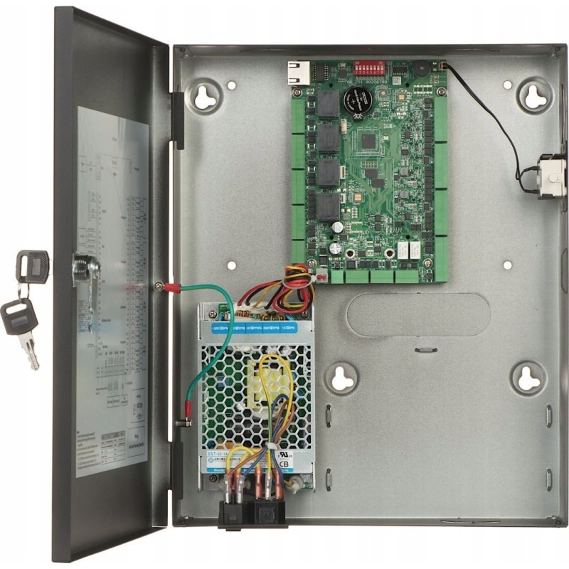 - Obsługa 2 drzwi (12 wejść: 2x stan blokady, 2x czujnik drzwi, 2x przycisk wyjścia, 6x linia alarmowa)