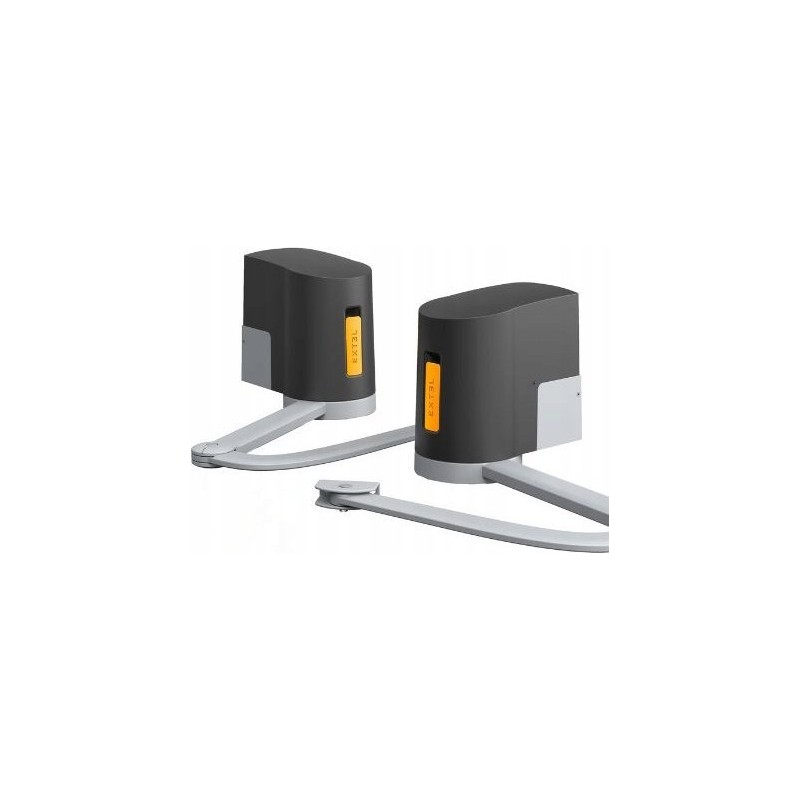 W skład zestawu wchodzą dwa silniki z obrotowymi ramionami i zintegrowaną elektroniką, co pozwala na otwieranie bramy zarówno do wewnątrz, jak i na zewnątrz posesji.