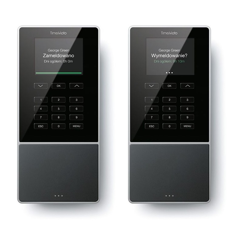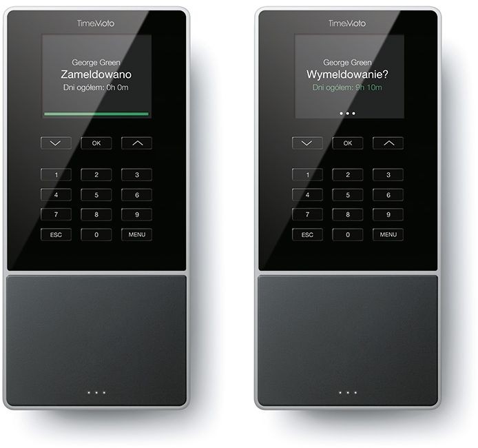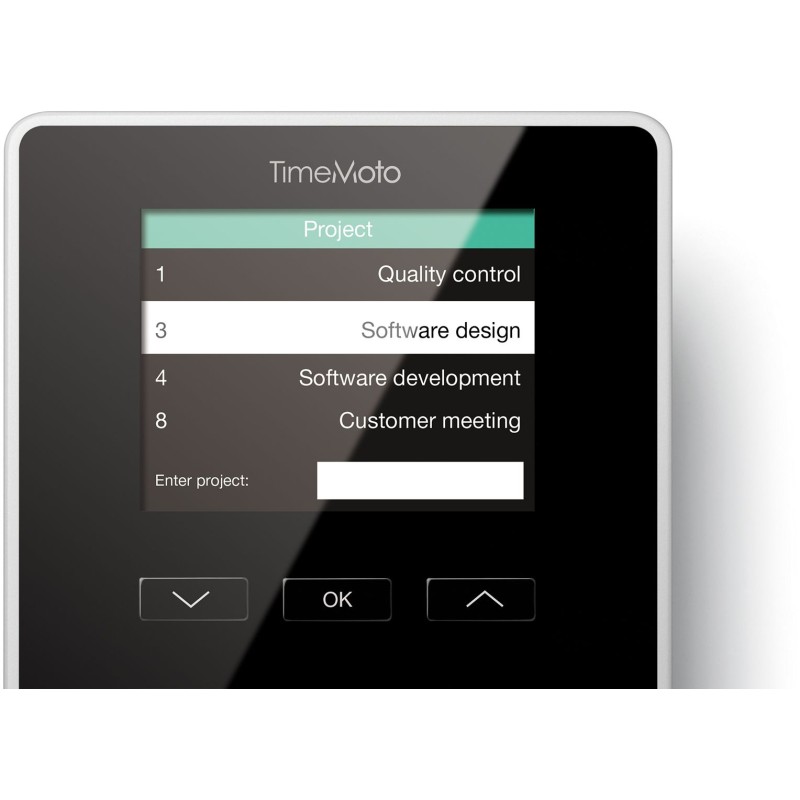 Możesz zapewnić atrakcyjny wygląd wejścia do firmy lub ściany dzięki eleganckiemu i wytrzymałemu TimeMoto TM-616. Średni ekran TFT o rozmiarze 2,8’’ przedstawia wyraźnie wszystkie informacje. Korzystaj z atrakcyjnie zaprojektowanego systemu rejestrowania czasu TimeMoto z łatwym w obsłudze i intuicyjnym interfejsem. Możesz podawać kody projektów, naciskając na przyciski. Pracownicy mogą z łatwością korzystać z osobistych danych o zarejestrowanym czasie i z łącznych wartości.