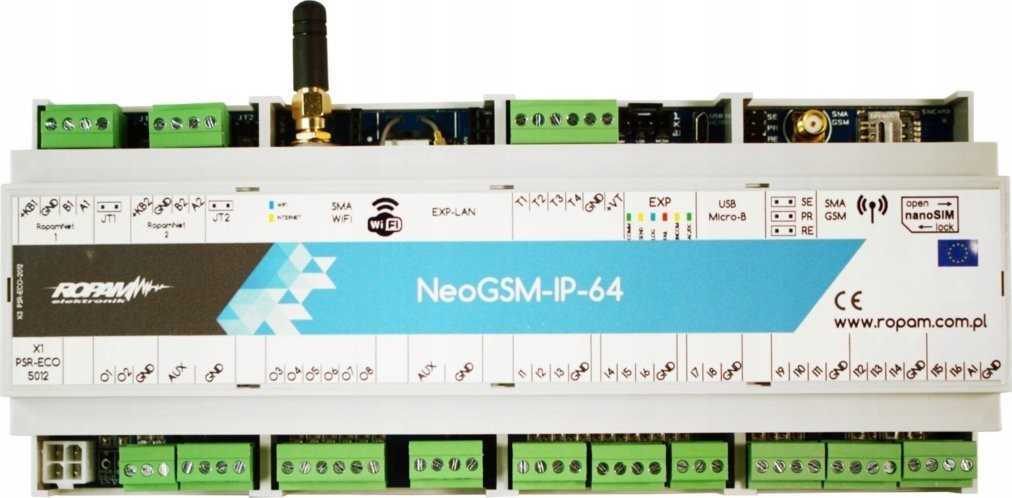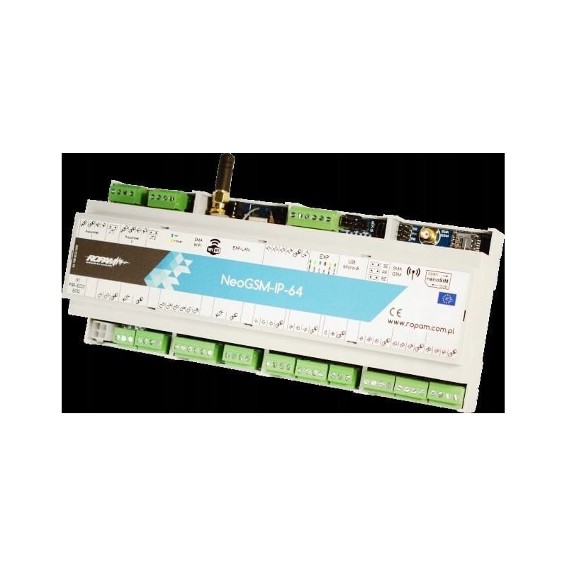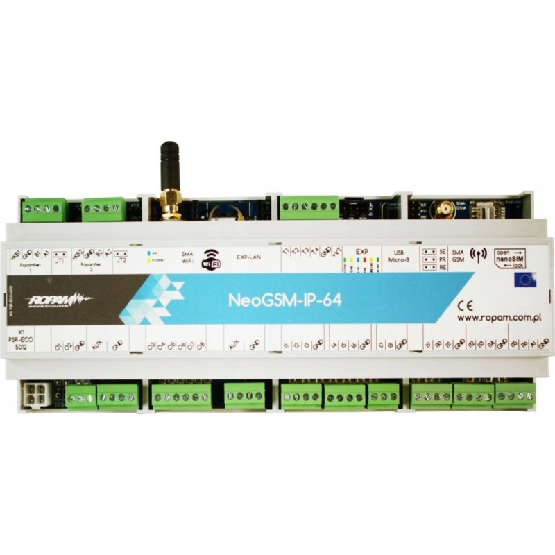Bezpieczna centrala alarmowa Ropam NeoGSM-IP-64-D12M z automatyką budynkową, komunikacja GSM i modułem WiFi w obudowie na szynę DIN