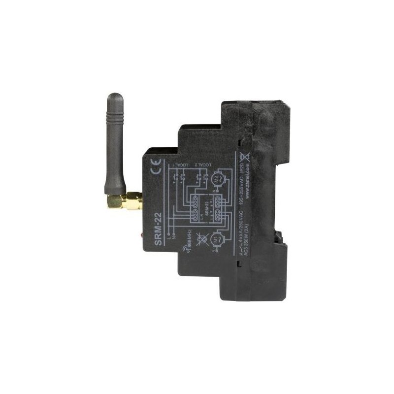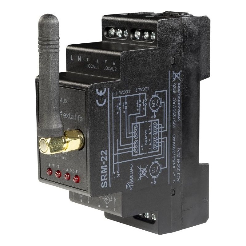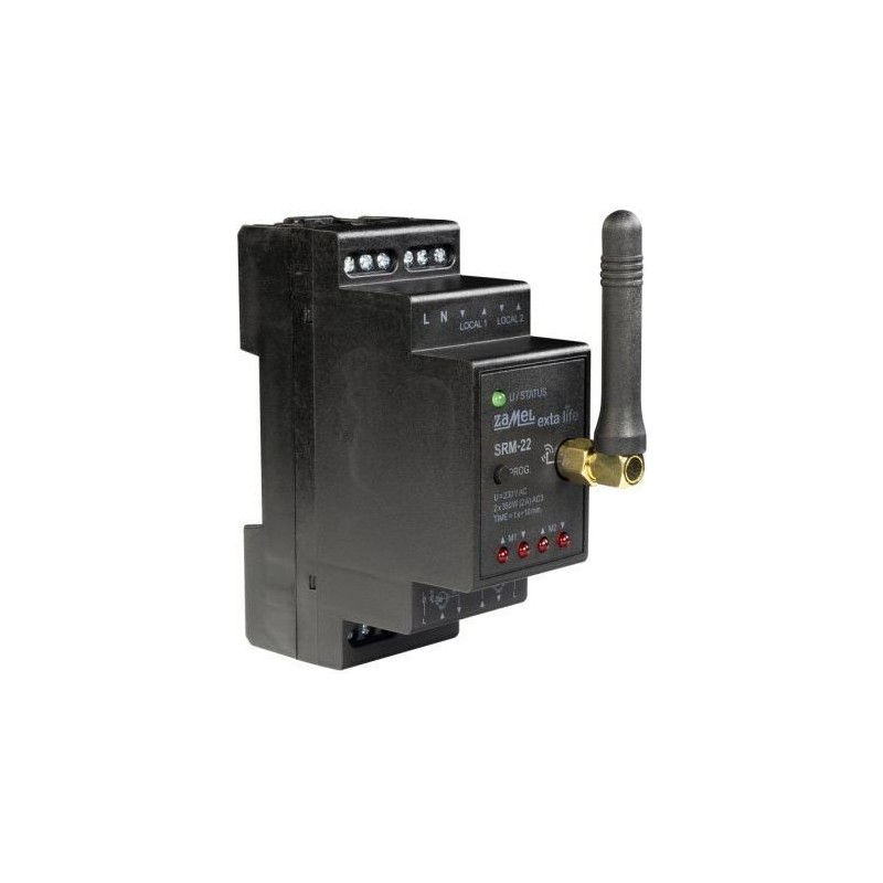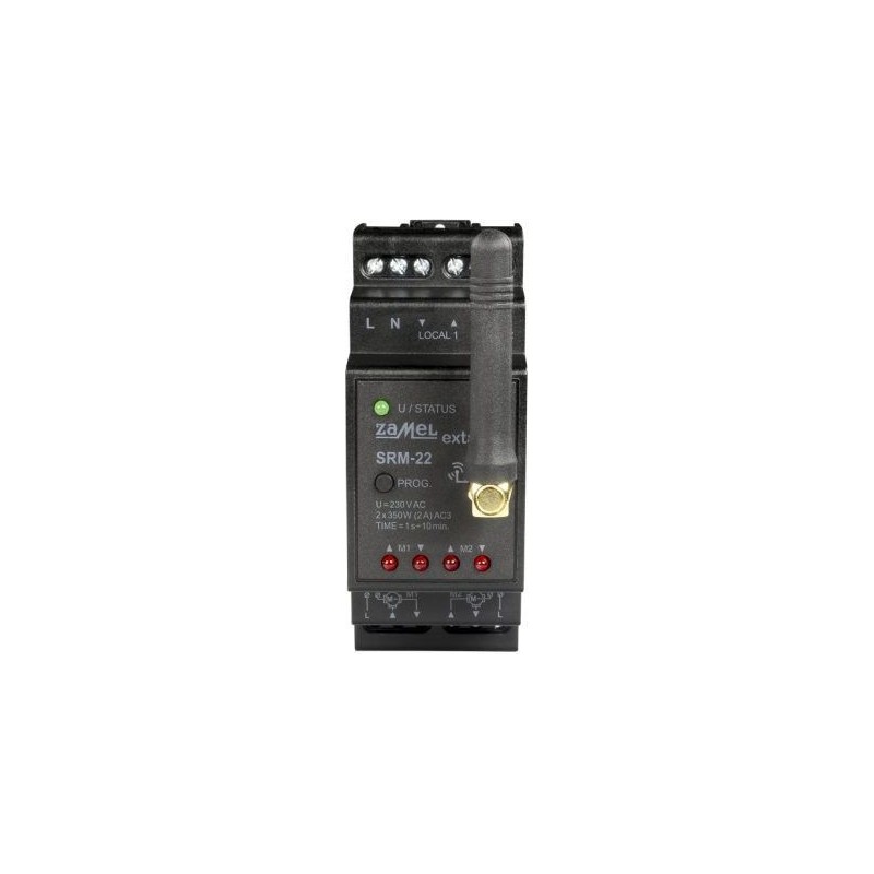 SRM-22 przeznaczony jest do sterowania roletami lub innymi urządzeniami napędzanymi silnikami jednofazowymi 230 V AC. Możliwe jest niezależne sterowanie dwoma roletami. Sterowanie może być prowadzone bezprzewodowo z poziomu nadajników lub kontrolera EXTA LIFE oraz przewodowo z poziomu przycisków żaluzjowych odbijających. Do sterowania przewodowego wykorzystuje się dwie pary wejść (IN1 oraz IN2), które są konfigurowalne poprzez aplikację mobilną. Wejścia mogą działać w trybie sterowania lokalnego lub centralnego. W obu przypadkach można stosować przyciski żaluzjowe podwójne lub pojedyncze. Dzięki komunikacji dwukierunkowej pomiędzy sterownikiem a kontrolerem aktualny stan rolety (poziom zamknięcia) widoczny jest w aplikacji mobilnej. Komunikacja dwukierunkowa umożliwia także parametryzację sterownika oraz zdalne dopisywanie nadajników (bez fizycznego dostępu do odbiorników). System kodowania ramek zapewnia bezpieczeństwo sterowania, co ma szczególne znaczenie w przypadku rolet okiennych i bram garażowych. SRM-22 poza kontrolerem może być także sterowany z poziomu nadajników systemu EXTA LIFE. Do jednego odbiornika można wpisać większą liczbę nadajników co daje możliwość sterowania roletami z kilku miejsc. Urządzenie przeznaczone jest do montażu w rozdzielnicach na szynie TH35. Oprogramowania sterownika może być zdalnie aktualizowane z poziomu kontrolera. Programowany czas ruchu każdej rolety oraz możliwość zdefiniowania do czterech ustawień ulubionych dodatkowo zwiększają funkcjonalność sterownika.