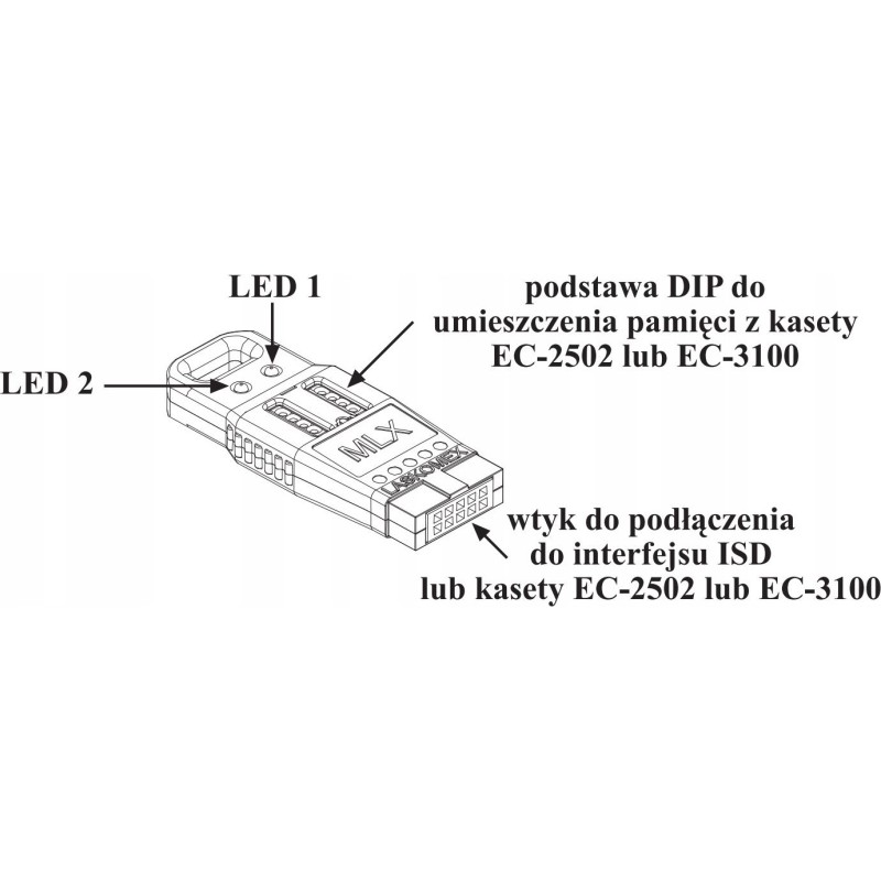 Działanie modułu jest bardzo proste, wystarczy umieścić go w gnieździe centrali domofonowej lub w panelu zewnętrznym domofonu CD-2600 i zaczekać ok. 8 sekund. Zmiana hasła instalatora jest sygnalizowana przez dwie diody LED. Moduł zasilany jest z systemu domofonowego, dlatego operację tę trzeba wykonać przy włączonym zasilaniu systemu domofonowego. Urządzenie może również pracować w trybie MLX-01 z ISD-02 lub w systemie domfonowym jako moduł pamięci. Do modułu można wtedy skopiować dane z pamięci EEPROM w centrali lub skopiować dane z modułu do centrali.