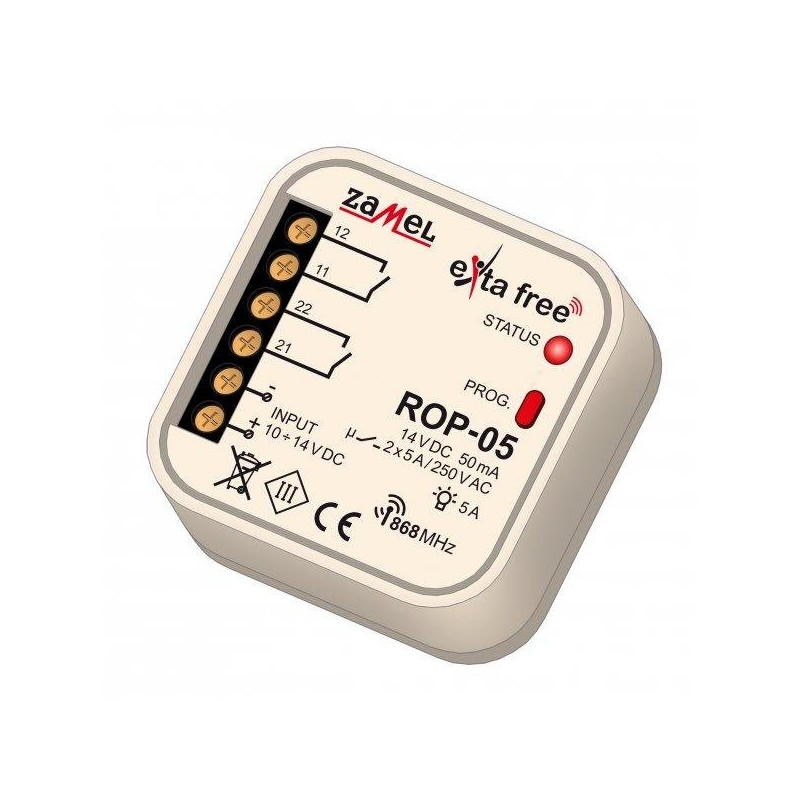 - 2 wyjścia przekaźnikowe beznapięciowe typu NO o maksymalnej obciążalności 5 A dla 250 V AC.