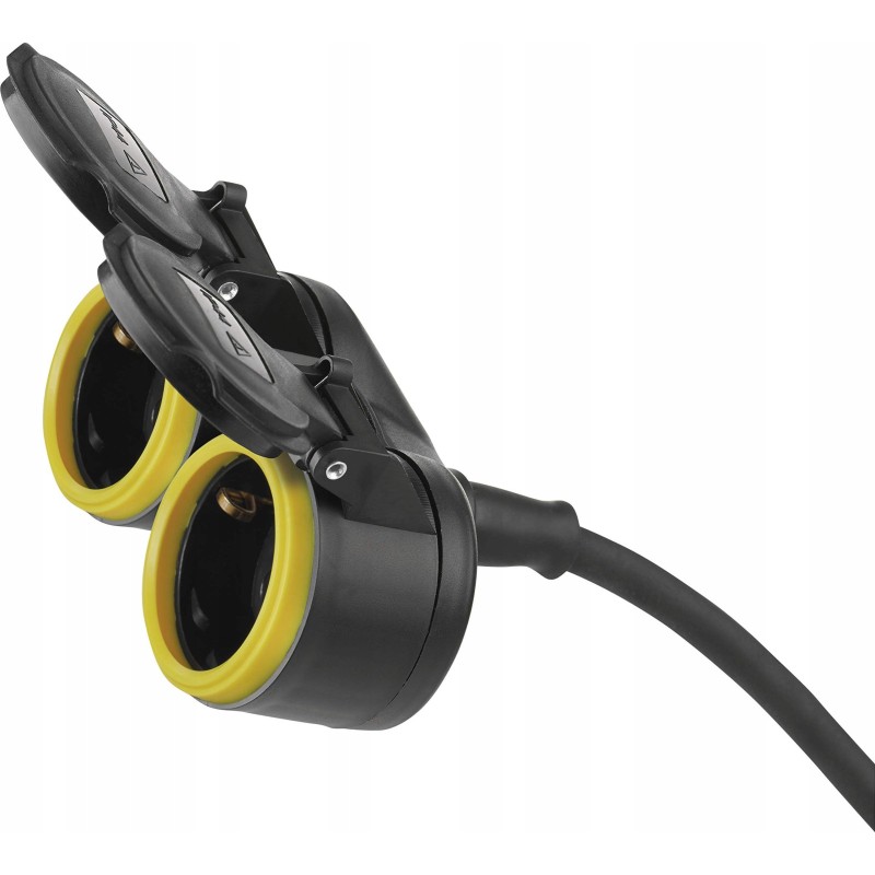 długość 10 m ilość gniazd 2× 2P + PE, IP44 napięcie/prąd 250 V~/16 A max. kolor czarny przewód H07RN-F3G 1,5 mm² przesłony torów prądowych typ izolacji guma materiał gniazda i wtyczki: tworzywo/guma maksymalne obciążenie 3 680 W