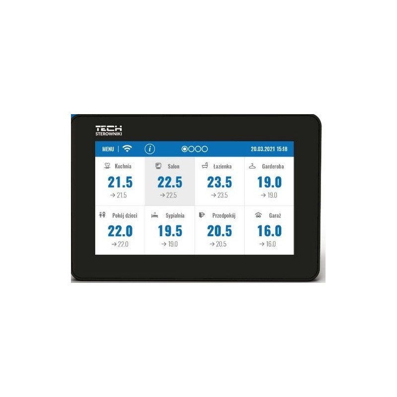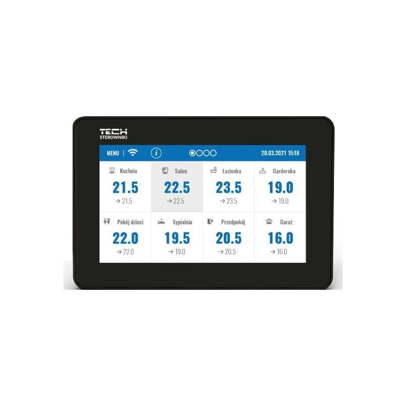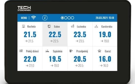 Ustawienia w podrzędnych sterownikach strefy można dokonać poprzez kliknięcie obszaru ekranu z informacją o jej stanie. Wygląd wyświetlacza panelu sterowania systemem ogrzewania można dostosować do własnych preferencji za pomocą funkcji ustawień ekranu. Można między innymi ustawić ekran zegara lub daty jako ekran uśpienia. Dodatkowo użytkownik może wybrać wersję kolorystyczną ekranu sterownika oraz włączyć lub wyłączyć dźwięk.