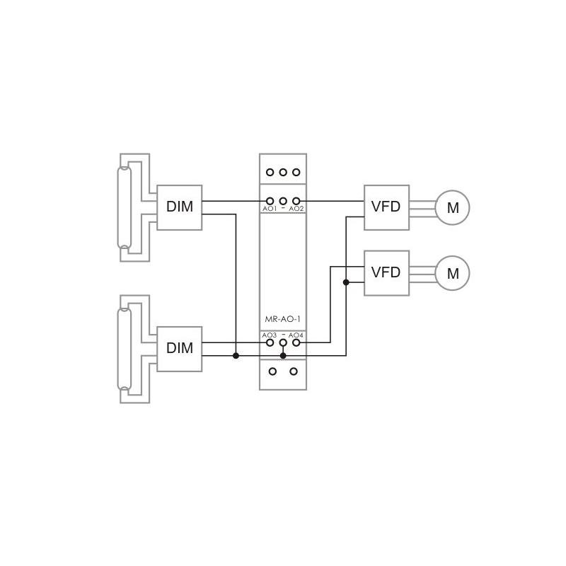 Moduł posiada 4 analogowe wyjścia napięciowe 0÷10V. Wartości napięć wyjściowych można ustawić lub odczytać poprzez port RS485 za pomocą protokołu komunikacyjnego MODBUS RTU.