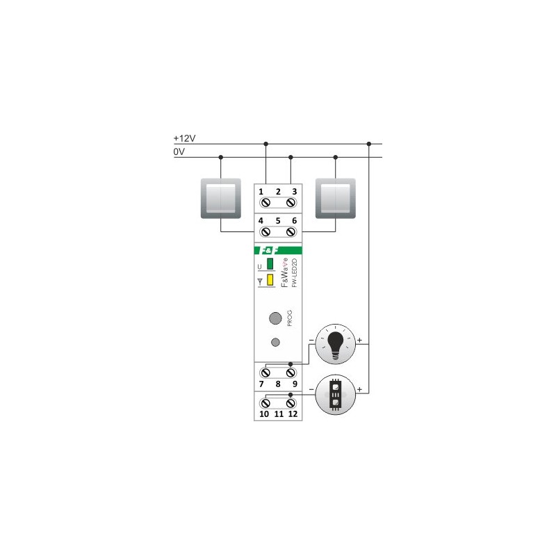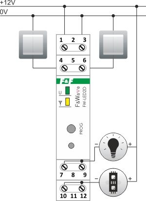 F&F Dwukanałowy sterownik LED 12V DC. Na szynę DIN. (LED2D)