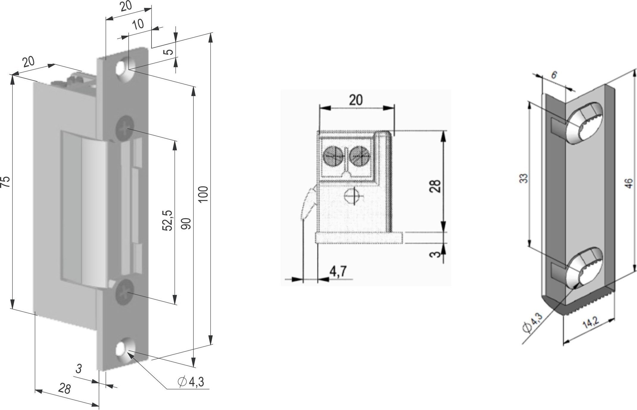 Wraz z elektrozamkiem klient otrzymuje uniwersalną, metalową listwę umożliwiającą montaż elektrozamka w słupku bramy lub ościeżnicy drzwi.