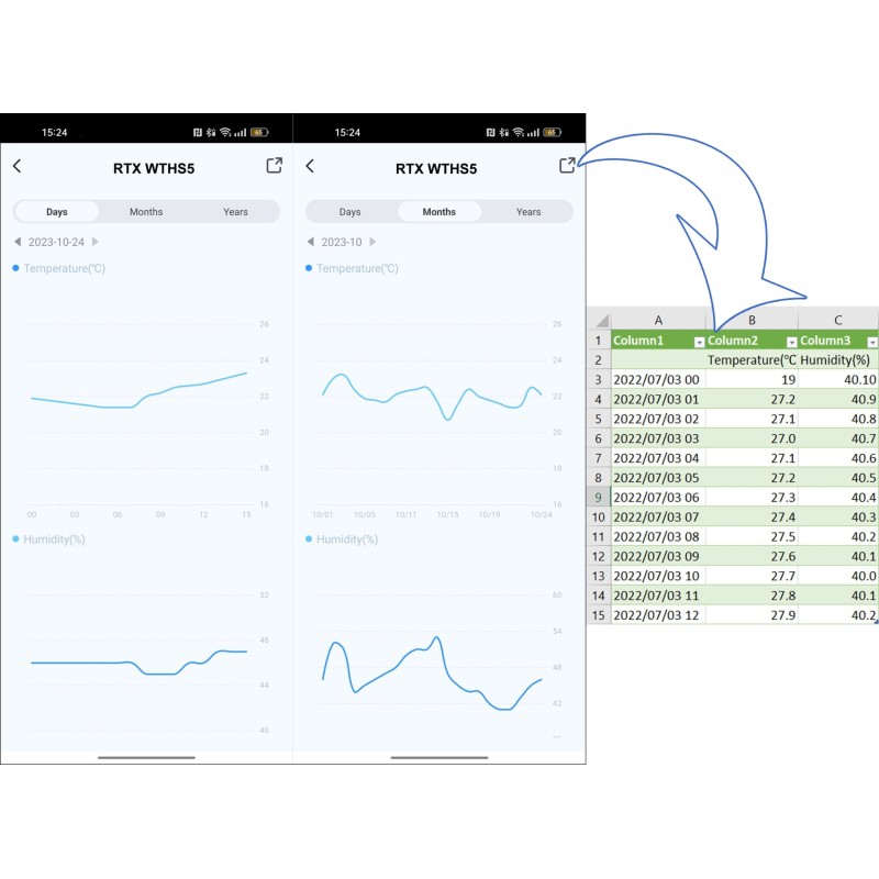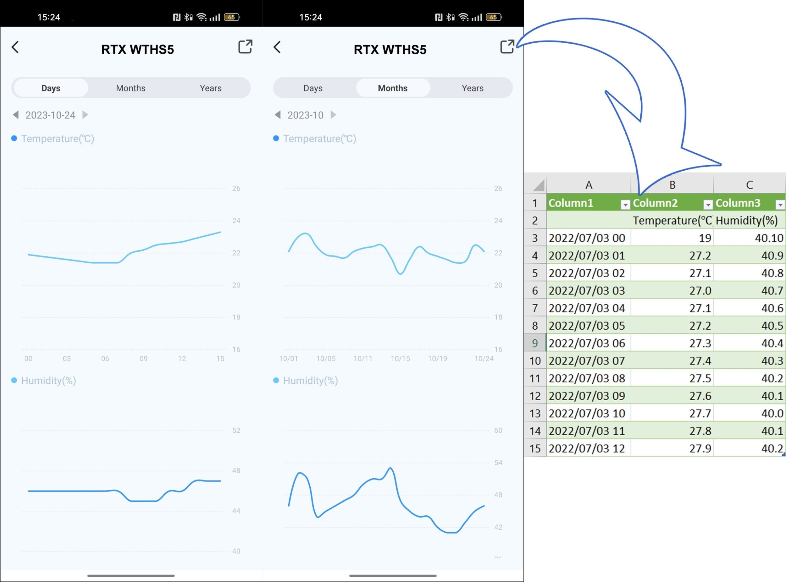 Czujnik posiada funkcję eksportu danych do pliku .csv, co pozwala na precyzyjne sprawdzenie jaka temperatura lub wilgotność były zmierzone w danym dniu lub godzinie w przeszłości.