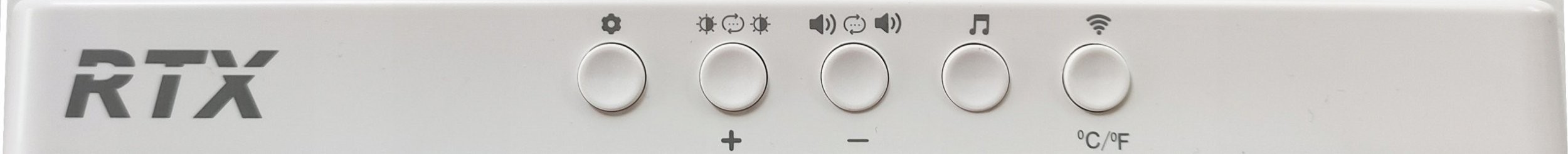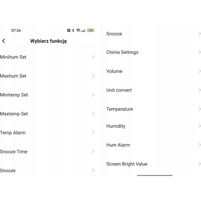 Ustawienie czasu/budzika, regulacja podświetlenia, ustawienie poziomu głośności budzenia, wybór melodii, parowanie/przełączanie stopni C/F