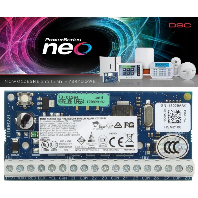 HSM2108 - moduł roszerzeń lini dozorowych (zapewniający dodatkowych 8 wyjść). Przeznaczony jest do współpracy z centralami alarmowymi PowerSeries NEO (HS2016, HS2032, HS2064, HS2128). Moduł posiada zabezpieczenie antysabotażowe. Maksymalna odległość od centrali alarmowej w jakiej może być zamontowany wynosi 305m.