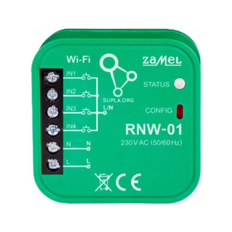 RNW-01 – Interfejs 4 wejść SUPLA Przeznaczony jest do realizacji takich funkcji jak zdalne załączanie / wyłączanie oświetlenia i urządzeń, zamykanie / otwieranie rolet okiennych i bram garażowych. Przeznaczony jest do montażu w puszkach podtynkowych (minimum Ø 60 mm) pod istniejącym osprzętem. Pozwala to na wykorzystanie osprzętu elektroinstalacyjnego dowolnego producenta i nie powoduje ograniczeń w zakresie designu i charakteru wnętrz. Nadajnik posiada cztery wejścia wyzwalane napięciem 230 V AC. Wyzwalanie jest realizowane poprzez zwarcie odpowiedniego wejścia z potencjałem fazy.