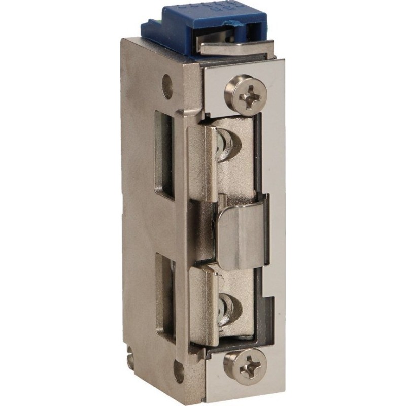 Elektrozaczep symetryczny, małogabarytowy wyposażony w dodatkową funkcję pamięci, która pozwala na sterowanie elektrozaczepem przez podanie krótkiego impulsu napięciowego. Po ustaniu impulsu stan otwarcia zaczepu podtrzymywany jest mechanicznie, aż do momentu otwarcia drzwi. Po zamknięciu drzwi zaczep samoczynnie się blokuje.