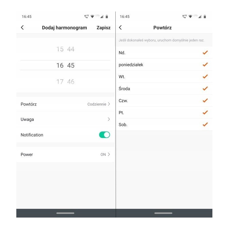 W aplikacji można skonfigurować harmonogram włączania i wyłączania.