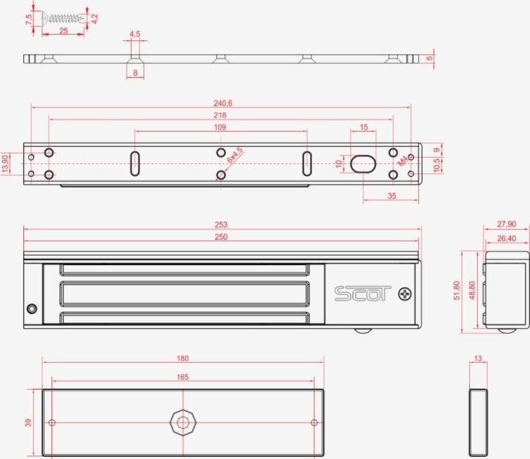 Zwory elektromagnetyczne SCOT są alternatywą dla powszechnie stosowanych w systemach kontroli dostępu elektrozaczepów. Zwora składa się z elementu wykonawczego zawierającego elektromagnes, montowanego na ramie drzwi, oraz metalowej płytki, umieszczanej na skrzydle drzwi. Zasilona cewka elektromagnesu przyciąga płytkę zabezpieczając w ten sposób wejście. W zależności od modelu zwory maksymalny nacisk na drzwi przy którym elektromagnes przyciąga metalową płytkę wynosi 180, 280, 350, 540 kg. Zwory elektromagnetyczne stosuje się w systemach kontroli dostępu zamiennie z elektrozaczepami rewersyjnymi, czyli tam, gdzie przepisy bezpieczeństwa wymagają otwarcia drzwi po zaniku napięcia w systemie kontroli: wyjściach ewakuacyjnych, przeciwpożarowych, budynkach użyteczności publicznej. Zwora elektromagnetyczna nie posiada ruchomych elementów mechanicznych, przez co praktycznie nie występuje zużycie elementów urządzenia. Z tego względu stosowana jest w miejscach o dużym natężeniu ruchu, gdzie kontrolowane drzwi są często otwierane, eliminując konieczność stałej konserwacji. Dodatkowe uchwyty montażowe typu „L”, „ZL”, „UL” pozwalają na montaż zwory praktycznie na każdych drzwiach. Zwora elektromagnetyczna wyposażona jest w przekaźnik NC, który może być wykorzystany w systemie kontroli dostępu informując o otwarciu / zamknięciu sterowanych drzwi. Dzięki temu możemy przekazać informację np. do systemu alarmowego, informując o stanie drzwi. Na boku zwory znajduje się dwukolorowa sygnalizacja informująca o stanie wejścia. Jeżeli drzwi są zamknięte, jest to sygnalizowane czerwonym kolorem diody – jeżeli drzwi zostaną otwarte lub będą niedomknięte – dioda będzie świecić kolorem zielonym. Jeżeli cewka zwory elektromagnetycznej nie jest zasilana (np. podczas trwania impulsu sterującego) – sygnalizacja jest wygaszona.