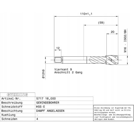 Ghring Machine tap for blind holes GUHRING HSS-E 5717 M16 x 2.0