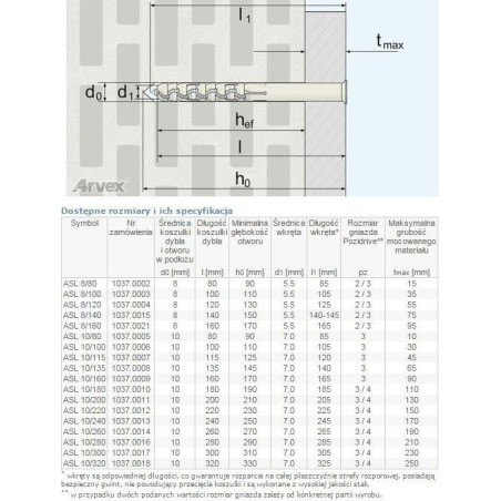 Arvex DYBEL RAMOWY ŁEB Z NACIĘCIEM KRZYŻOWYM ASL 10/320MM