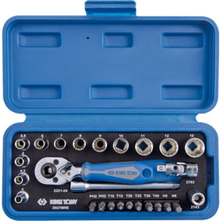 Zestaw narzędzi King Tony ZESTAW NARZĘDZI 1/4" 27cz. NASADKI KRÓTKIE, 12-kąt. 4 - 14mm Z GRZECHOTKĄ I AKCESORIAMI, KASETA King T 171,88 zł Dodaj do koszyka