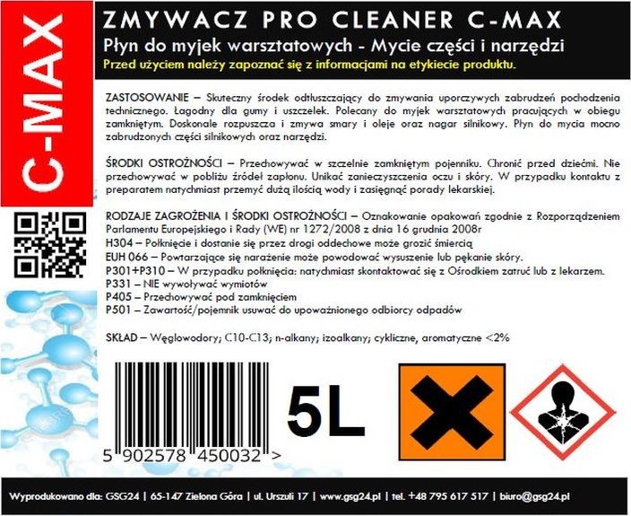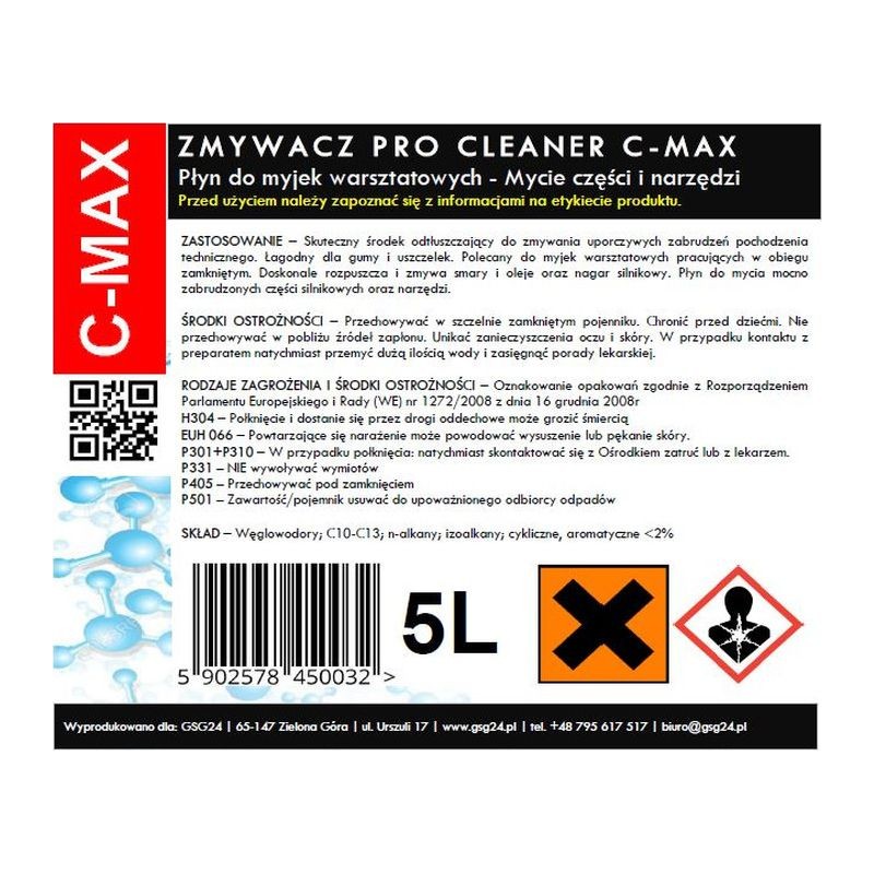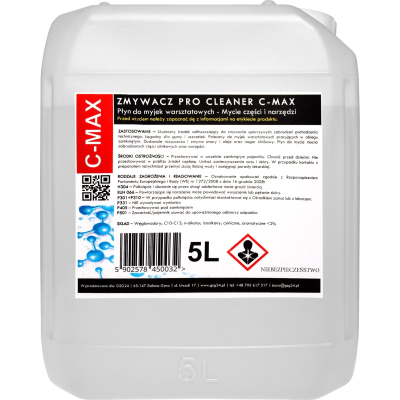 Nazwa producenta: PRO CLEANER C-MAX 5LProfesjonalny płyn zmywający posiadający doskonałe właściwości czyszczące i odtłuszczające. Skład chemiczny środka PRO CLEANER C-MAX opiera się na bazie rozpuszczalników odaromatyzowanych i został specjalnie dobrany pod kątem maksymalnej skuteczności przy zachowaniu reżimów ekologicznych. Zmywacz przeznaczony jest do myjek warsztatowych w przemyśle motoryzacyjnym i metalowym, przy produkcji oraz w zakładach usługowych. Doskonale rozpuszcza i zmywa smary, oleje, nagary oraz inne uporczywe zabrudzenia pochodzenia technicznego.Najważniejsze cechy płynu PRO CLEANER C-MAX- rozpuszcza oleje i smary- skutecznie usuwa większość zanieczyszczeń i zabrudzeń- nie powoduje korozji- nie jest agresywny dla tworzyw sztucznych i gumy- posiada niski stopień parowania- prawie bezwonny- niska toksyczność dla człowieka i środowiska- nie podrażnia skóry- posiada atest PZHZastosowania płynu PRO CLEANER C-MAX- płyn dedykowany jest do myjek warsztatowych pracujących w obiegu zamkniętym- idealny środek do mycia części silnikowych i motoryzacyjnych- w przemyśle na końcowym etapie produkcji- serwisy i zakłady usługowe- regeneracja i odnawianie podzespołów mechanicznychitp...W zestawie:- 5 litrów płynu PRO CLEANER C-MAX 5LPolecamy profesjonalne CZYŚCIWA PRZEMYSŁOWE dostępne w naszym sklepie, które doskonale uzupełnią cały proces mycia i czyszczenia części i narzędzi....