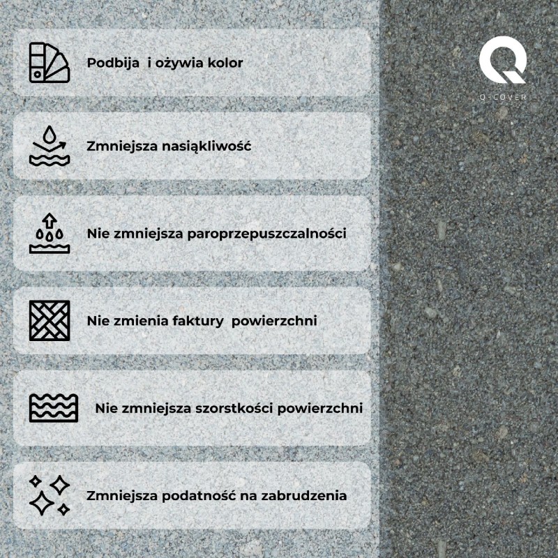 Impregnat nadaje efekt "mokrej kostki", co znacząco zwiększa atrakcyjność powierzchni, ożywiając kolory i ujednolicając wygląd. Dzięki matowemu wykończeniu, produkt nie tylko chroni, ale również poprawia estetykę otoczenia.