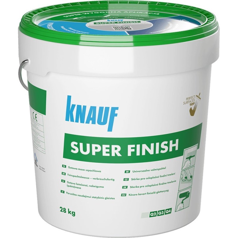 Gotowa masa Knauf Super Finish jest mieszanką mączki dolomitowej z lepiszczem winylowym. Dodatkowo zawiera składniki poprawiające własności użytkowe gotowych mas. Super Finish spełnia wymagania Normy EN 13963 oraz posiada Atest Higieniczny dopuszczający do stosowania w budownictwie mieszkaniowym, obiektach służby zdrowia, żłobkach, przedszkolach i szkołach, w przemyśle spożywczym i podobnych