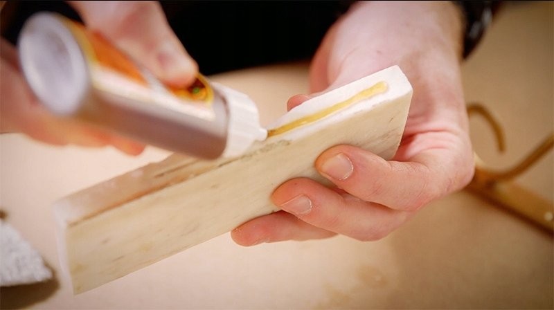 Zwilż: Delikatnie zwilż jedną powierzchnię wodą. Zalecamy użycie wilgotnej szmatki lub spryskanie wodą. Nie zalewaj powierzchni. W przypadku twardego drewna możesz delikatnie zwilżyć obie powierzchnie przed sklejeniem.
