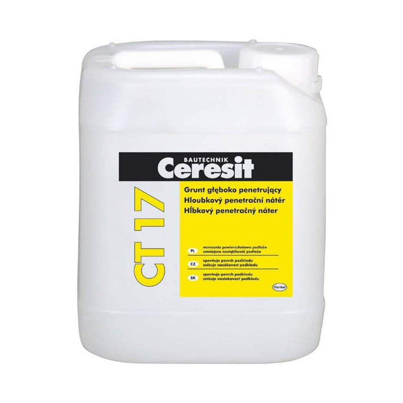 Preparat Ceresit CT 17 służy do gruntowania podłoży wewnątrz i na zewnątrz budynków przed mocowaniem płytek ceramicznych, wylewaniem posadzek, szpachlowaniem, malowaniem czy mocowaniem płyt izolacji termicznej. Grunt nie zawiera rozpuszczalnika. Zagruntowane CT 17 podłoża (wszelkiego rodzaju tynki, betony, jastrychy) mają mniejszą nasiąkliwość, co zapobiega zbyt szybkiemu przesychaniu zapraw klejących, posadzek, szpachlówek czy farb. Preparat wnika w podłoże i wiąże ziarna kruszywa, nie powoduje jednak zwiększania parametrów wytrzymałościowych w całym przekroju podłoża. Stosowanie CT 17 szczególnie zalecane jest na podłoża gipsowe, anhydrytowe i gazobetonowe. Jest on odpowiedni także do gruntowania płyt wiórowych i nie impregnowanych płyt gipsowo-kartonowych. Preparat powoduje żółtawe zabarwienie podłoży. Do gruntowania podłoży pod tynki cienkowarstwowe stosować farbę gruntującą Ceresit CT 16 lub CT 15.