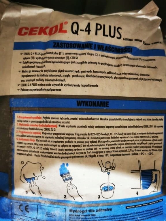 Warstwa hydroizolacji. Aby zapewnić szczelność, należy zastosować jednoskładnikową zaprawę uszczelniającą CEKOL ZU-1 lub dwuskładnikową zaprawę uszczelniającą CEKOL ZU-2. Przygotowanie mieszanki. Mieszankę należy przygotować, wsypując 1 kg proszku do 0,23-0,25 l wody (4,6 - 5 l wody na 20 kg worka) i dokładnie wymieszać mieszadłem o wolnym obrocie, aż do uzyskania jednolitej konsystencji. Zaczekać około 3 minut i ponownie dokładnie wymieszać. Czas użycia zaprawy to około 3 godzin. Nakładanie kleju. Na odpowiednio przygotowane podłoże nanosić klej za pomocą paci z ząbkami. Przy mocowaniu płytek na podgrzewanych powierzchniach należy wyłączyć ogrzewanie. Można je włączyć nie wcześniej niż po upływie 7 dni od położenia płytek. Tam, gdzie istnieje ryzyko wnikania wody, należy zastosować warstwę hydroizolacji.