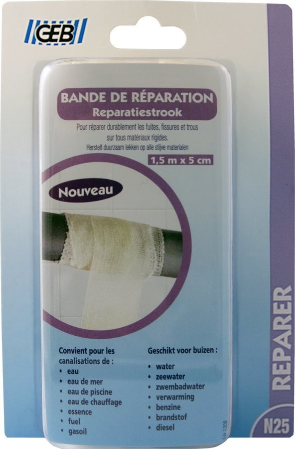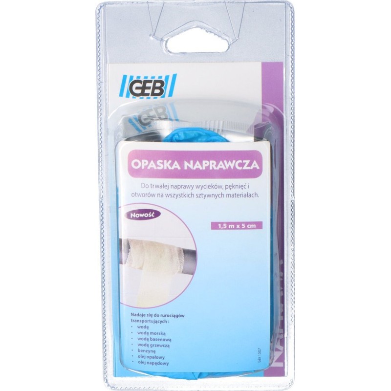 Opaska naprawcza stworzona z tkaniny włókna szklanego, pokryta żywicą poliuretanową - służy do trwałej naprawy wycieków, pęknięć i otworów w instalacjach lub innych przewodach sztywnych. Opaska tkaninowa - naprawcza GEB o długości 1,5 m i szerokości 5 cm.