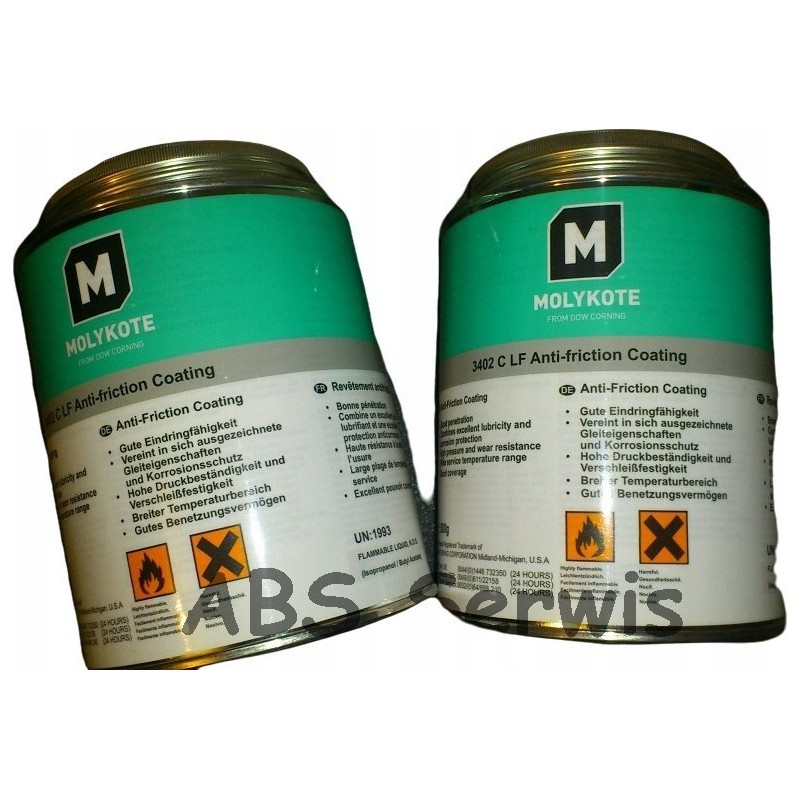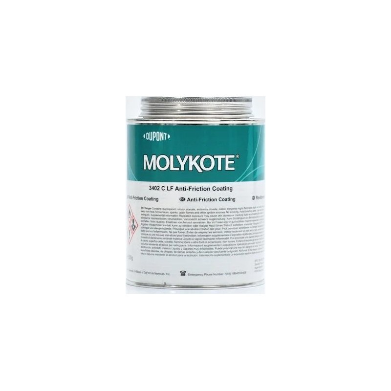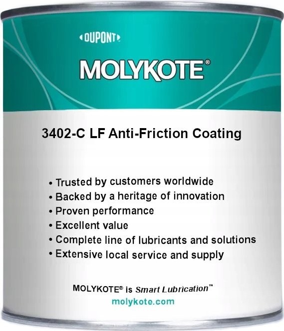 MOLYKOTE® 3402-C LF Anti-Friction Coating to wszechstronny i łatwy w użyciu, utwardzany powietrzem smar, który zapewnia doskonałą ochronę przed korozją połączeń metal-metal. MOLYKOTE® 3402-C LF został opracowany z użyciem rozpuszczalnika na bazie organicznej do szybkiego schnięcia w temperaturze pokojowej, a powstały w ten sposób smar w postaci suchej warstwy może wytrzymać niewiarygodnie wysokie ciśnienia i wykazuje fantastyczne właściwości przeciwzużyciowe. MOLYKOTE® 3402-C LF może być nakładany różnymi popularnymi metodami, w tym przez zanurzanie, natryskiwanie, wirowanie lub malowanie pędzlem na powierzchnię o zalecanej grubości 5-20 µm.