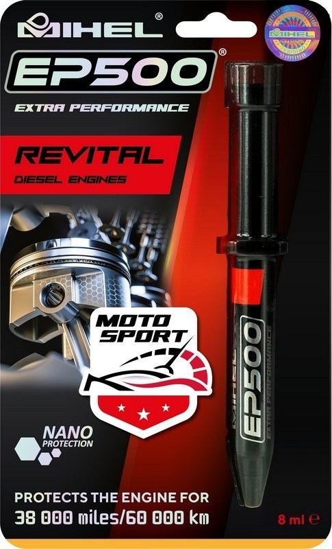 Mihel EP 500 MOTO SPORT – preparat o wysokiej skuteczności działania, przeznaczony do ochrony i rewitalizacji silników Diesla, mocno obciążanych, eksploatowanych w ekstremalnych warunkach, gdzie występują wysokie temperatury. Innowacyjna formuła nano cząsteczek o wysokiej zdolności powierzchniowo czynnej tworzy na strukturze metalu wytrzymałą stabilną powłokę ochronną ceramiczno-metalową o niskich współczynnikach oporu i doskonałych właściwościach przewodności cieplnej. Powoduje znaczne obniżenie tarcia oraz stałą ochronę podzespołów, praktycznie eliminując proces ich zużycia. Regularne stosowanie pozwala znacząco wydłużyć żywotność silnika. Zapewnia ochronę na 38 000 mil / 60 000 km.