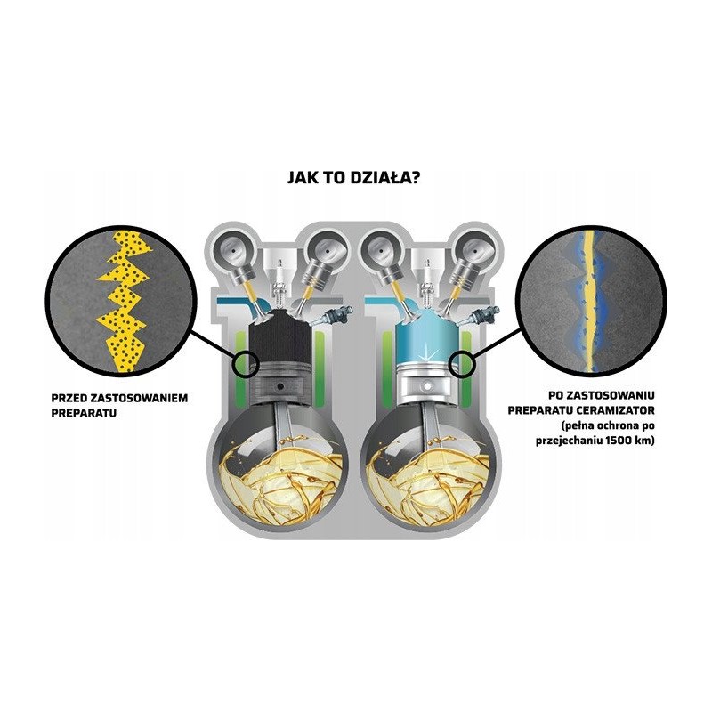Proces ceramizacji polega na nałożeniu preparatu na rozgrzany silnik, co umożliwia skuteczne wnikanie aktywnych składników w struktury metalowe. W ten sposób ceramizator tworzy trwałą powłokę, która chroni silnik przed zużyciem i poprawia jego wydajność.