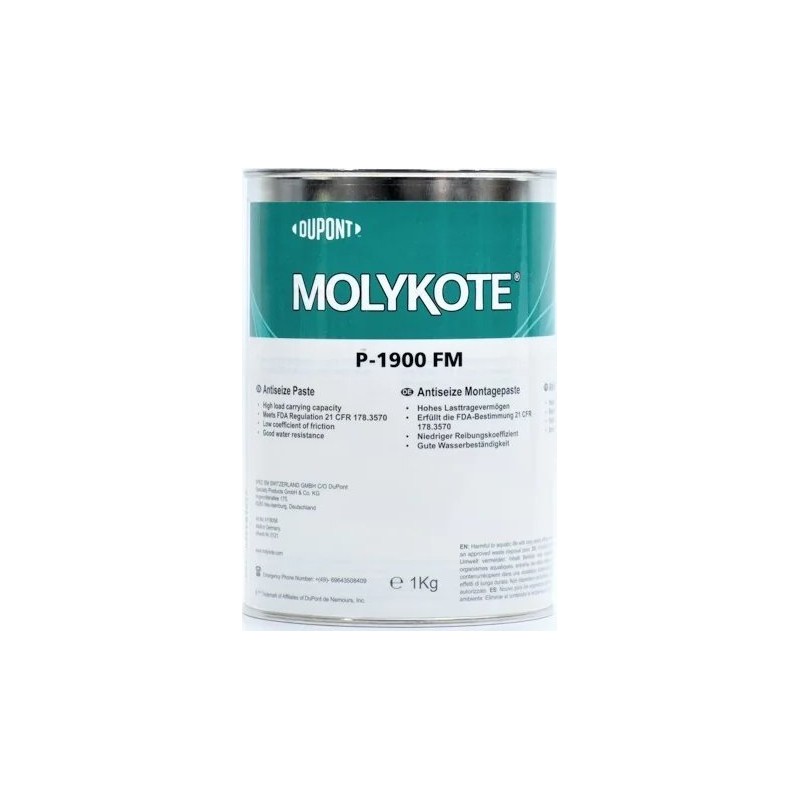 Molykote P-1900 FM pasta przeciwzatarciowa to wysoce wydajny olej na bazie mineralnej o unikalnym połączeniu zagęszczacza aluminium i stałych dodatków smarnych do wszechstronnego stosowania w produkcji przemysłowej i wrażliwej na kontakt z żywnością. Produkt spełnia wymagania FDA Reg. 21 CFR 178.3570 i jest zarejestrowany w NSF jako produkt H1 do przypadkowego kontaktu z żywnością. Pasta Molykote P-1900 FM zapewnia długotrwałe smarowanie metalowych połączeń o wysokiej wytrzymałości i bardzo niskim współczynniku tarcia.