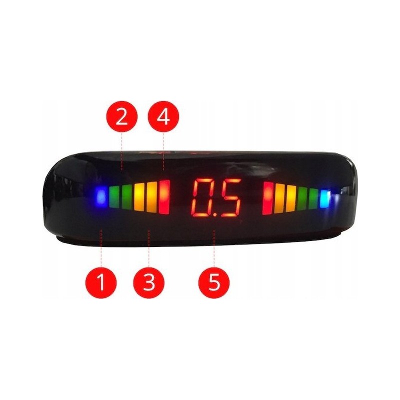 Zestaw zawiera komplet czujników na tył pojazdu oraz nowoczesny, kolorowy wyświetlacz wskazujący odległość pojazdu od przeszkody.