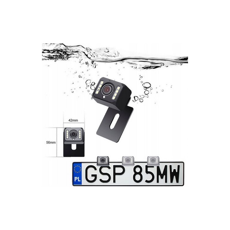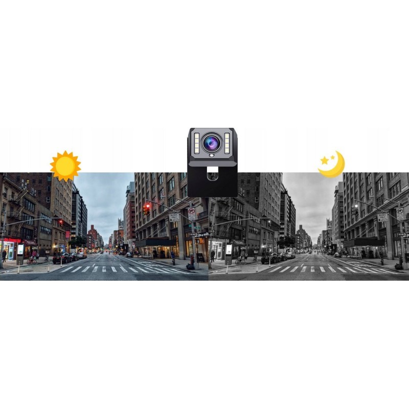 - Kamera HD IP68, z szerokim kątem widzenia 115° (poziom) i 150° (diagonalny), wbudowanymi diodami LED do pracy w nocy oraz możliwością automatycznego wyświetlania linii pomocniczych.