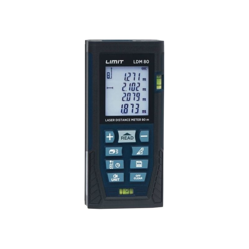 Limit LDM 80 to solidny, kompaktowy dalmierz laserowy przeznaczony do profesjonalnego użytku również w trudnych warunkach. Mierzy dystans do 80 metrów i jest łatwo przenośny w torbie lub kieszeni. Szybki czas reakcji. Wysoka dokładność ± 2 mm. Podświetlany wyświetlacz. Samokalibrujący. Prosty pomiar odległości punkt-punkt, pomiar pola powierzchni i objętości, pomiar z opóźnieniem czasowym, funkcja tyczenia, pomiar z wykorzystaniem twierdzenia Pitagorasa, funkcja pomiaru ciągłego (śledzenie). Pomiary z dodawaniem i odejmowaniem, oraz funkcja zapisu. Wybór punktu odniesienia: przednia krawędź, środek przyrządu lub odkładany element tylny. Przełączanie jednostek: metry, stopy i cale. Automatyczne wyłączanie. Dostarczany z futerałem i paskiem na nadgarstek. Baterie w załączeniu.